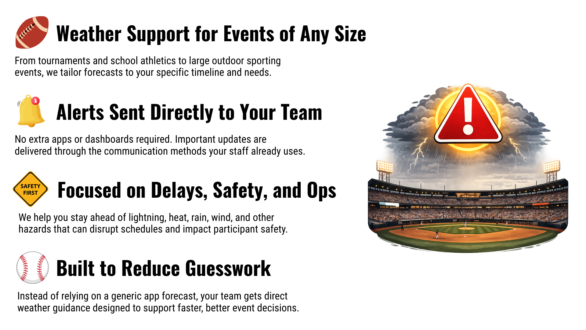 Forecast Support Built for Game Day Bolt Weather Solutions helps sporting events stay ahead of changing weather with clear forecasts, direct alerts, and decision-focused support designed for schedules, safety, and operations.